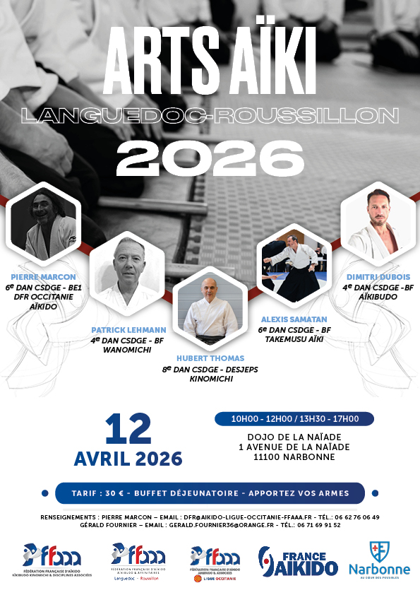 Stage Arts Aiki Le 12 avril 2026 10h00-12h00 et 13h30-17h00 Dojo de la Naiade, 1 avenue de la Naiade, 11100 Narbonne 30 euros